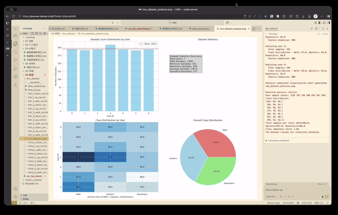 例如中国科学院大学电子信息专业研二的周同学在研究时间序列信号处理时,只需一句指令:“调研最新进展并分析一个典型公开数据集”,他山·科研IDE便自动完成全流程:检索近年论文并总结方法趋势;下载公开数据集至本地;生成可运行Python脚本,实现数据加载、预处理、特征提取与可视化(如时域、频谱、分类效果);并将结果嵌入调研报告。从想法到可验证结果,全程无需切换工具或手写代码,仅需15分钟。